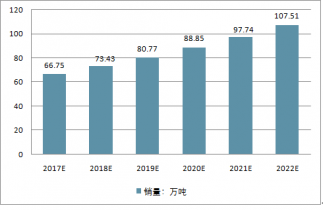 未來幾年行業(yè)保持穩(wěn)定增長,預(yù)測到2022年,市場銷量約為107.51萬噸。