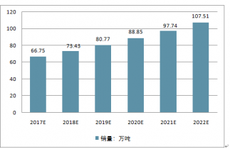 未來幾年行業(yè)保持穩(wěn)定增長(zhǎng),預(yù)測(cè)到2022年,市場(chǎng)銷量約為107.51萬噸。