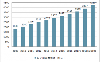 2009-2019年中國日化用品零售額(億元)