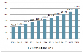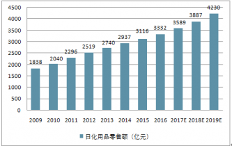2009-2019年中國(guó)日化用品零售額(億元)