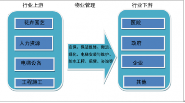 物業(yè)管理行業(yè)屬于服務(wù)型行業(yè),上游是人力資源、保潔用品、安防用品等行業(yè);下游直接客戶是房地產(chǎn)開發(fā)企業(yè)、市政機(jī)關(guān)、醫(yī)療機(jī)構(gòu)、企業(yè)辦公、公共設(shè)施、學(xué)校、住宅小區(qū)等。