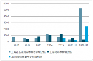 2011-2016.1-6月上海社會(huì)消費(fèi)品零售總額增加額與網(wǎng)絡(luò)零售額增加額