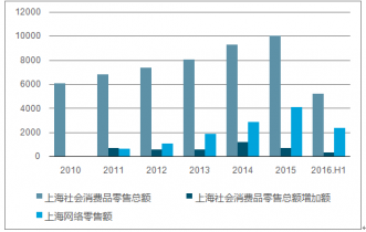 2010-2016上半年上海社會消費品零售總額與網(wǎng)絡(luò)零售額