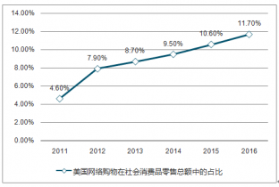 2011-2016年美國網(wǎng)絡(luò)購物在社會消費品零售總額中的占比