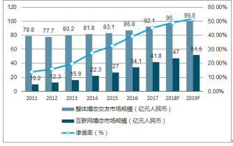 2011年至2019年中國整體及互聯網婚戀交友市場規模及滲透率情況
