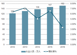 2012-2016年我國(guó)箱包行業(yè)從業(yè)人員及增長(zhǎng)率走勢(shì)