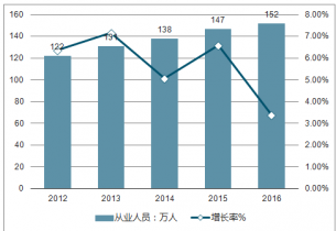 2012-2016年我國(guó)箱包行業(yè)從業(yè)人員及增長(zhǎng)率走勢(shì)