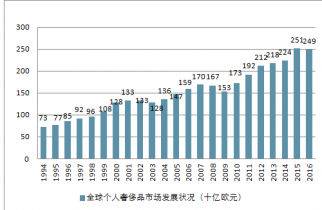 1994-2016年全球個(gè)人奢侈品市場(chǎng)發(fā)展?fàn)顩r(十億歐元)
