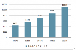 2013年,我國保健品行業(yè)產(chǎn)值為1,624億元,同比增長了39.88%;2014年產(chǎn)值達2,083億元,同比增長了28.26%;2015年,我國保健品消費市場規(guī)模大概有2,198.53億元。預(yù)計2019年我國保健品行業(yè)產(chǎn)值將達到4,419億元,2021年達到11,035億元,未來五年(2017-2021年)年均復(fù)合增長率約為25.71%。
