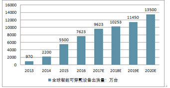 2013-2020全球可穿戴設備出貨量(萬臺)