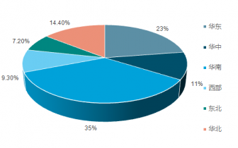 我國區(qū)域分布上,華南地區(qū)規(guī)模居于首位,其次是華東、華北、華中、西北及東北地區(qū)。