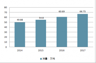 2014年我國(guó)香精香料行業(yè)產(chǎn)量為49.88萬(wàn)噸,2015年達(dá)到54.80萬(wàn)噸,同比上年增長(zhǎng)9.8%,2016年全年的銷(xiāo)量為60.69萬(wàn)噸,同比增長(zhǎng)10.75%,2019年達(dá)到66.75萬(wàn)噸。