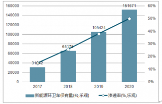 2017-2020年中國新能源環(huán)衛(wèi)車保有量及滲透率(臺,%,樂觀)