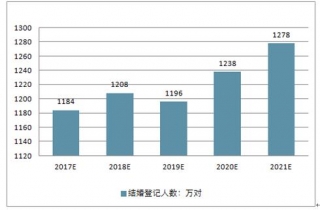 預(yù)計(jì)2017年我國結(jié)婚登記人數(shù)將達(dá)到1,184萬對,未來五年(2017-2021)年均復(fù)合增長率約為1.91%,2021年結(jié)婚登記人數(shù)將達(dá)到1,278萬對。