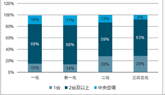 中央空調(diào)保有量最高的為高速發(fā)展的新一線城市,目測新一線城市最具消費力,一線城市受房價壓力等影響甚至較弱于新一線城市,當(dāng)然,也有可能是樣本差異的問題。而在三四線城市有空調(diào)的家庭中,中央空調(diào)占比也可達到 8%。