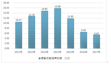 2011-2019年中國(guó)糖蜜發(fā)酵酒精行業(yè)市場(chǎng)規(guī)模情況