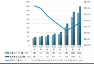 2009-2016年我國鋁基板行業(yè)產(chǎn)量及占比金屬基板產(chǎn)量比重 |