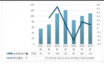 2011-2019年生物柴油行業(yè)生產(chǎn)總量及增速
