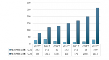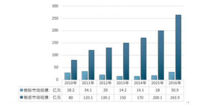 目前,我國銀粉和銀漿行業(yè)內企業(yè)眾多,市場集中度較低,2016年我國銀粉市場規(guī)模為30.9億元,銀漿市場規(guī)模為263.9億元。