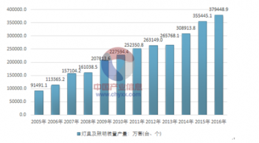 2015年我國燈具及照明裝置產量為355445.1萬套(臺、個),2016年國內產量增長至379448.9萬套(臺、個)。