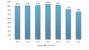 2010-2016年我國木材產(chǎn)量(單位:萬平方米)