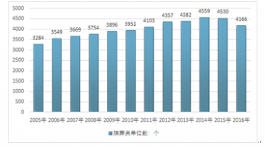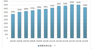 2005-2016年我國各類型殯葬服務(wù)機(jī)構(gòu)數(shù)統(tǒng)計