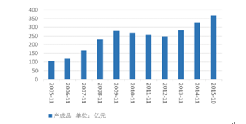 從產(chǎn)成品的角度看,2005-2014年產(chǎn)成品基本呈現(xiàn)出持續(xù)增長(zhǎng)的趨勢(shì),期間2009-2011年有輕微的下降趨勢(shì),系2008年全球金融危機(jī)的后續(xù)影響所致。