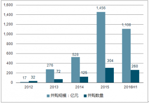 2012-2016年上半年中國互聯網行業并購規模和數量