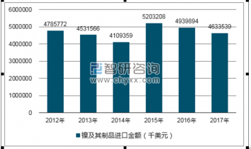2019年我國(guó)鎳及其制品進(jìn)口數(shù)量為636001357千克,進(jìn)口金額為4633539131美元;2016年我國(guó)鎳及其制品進(jìn)口數(shù)量為713371260千克,進(jìn)口金額為4939893740美元。