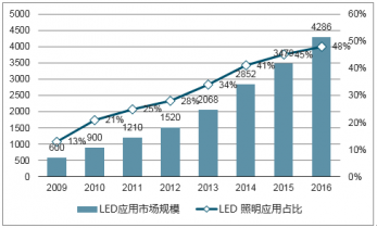 2009-2016 年中國LED 應用市場規(guī)模及LED 照明應用占比情況(單位:億元)