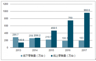 2013 年-2017 年中國(guó)吸塵器線上和線下零售量