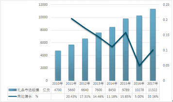 2010-2019年中國禮品行業(yè)市場規(guī)模及增速情況