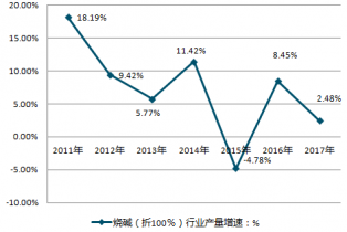 2011-2019年中國燒堿(折100%)行業(yè)產(chǎn)量增速情況