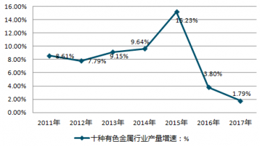 2011-2019年中國十種有色金屬行業(yè)產(chǎn)量增速情況
