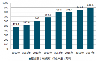 2010-2019年中國(guó)精煉銅(電解銅)行業(yè)產(chǎn)量情況
