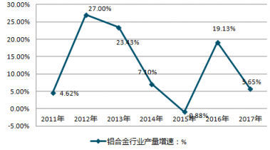 2011-2019年中國(guó)鋁合金行業(yè)產(chǎn)量增速情況