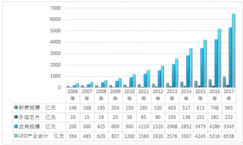 近年來,我國 LED 產(chǎn)業(yè)高速發(fā)展。根據(jù)國家半導(dǎo)體照明工程研發(fā)及產(chǎn)業(yè)聯(lián)盟的統(tǒng)計數(shù)據(jù),2019年度,包括外延片及芯片制造、封裝、應(yīng)用在內(nèi)的我國LED行業(yè)總產(chǎn)值達(dá)到6538億元,同比增長25.35%,相比2006年的356億元,近十一年的年均復(fù)合增長率為 30.29%。