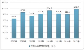 據(jù)統(tǒng)計(jì)2016年我國乙二醇市場規(guī)模為810.5億元,2019年我國乙二醇市場規(guī)模達(dá)到978.0億元。