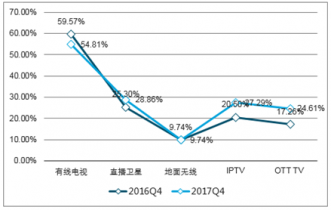 受廣播電視沖擊,有線電視用戶規(guī)模下滑,收視份額下降。2019年有線電視用戶規(guī)模持續(xù)下降,用戶增長(zhǎng)達(dá)到天花板,同時(shí)2017Q4有線電視的收視份額同比下滑,雖然總體份額在電視收視中仍保持領(lǐng)先優(yōu)勢(shì),但增長(zhǎng)空間受限,整體行業(yè)環(huán)境日趨嚴(yán)峻。