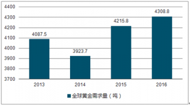 2013-2019年全球黃金需求量走勢(shì)圖