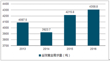 2013-2019年全球黃金需求量走勢圖