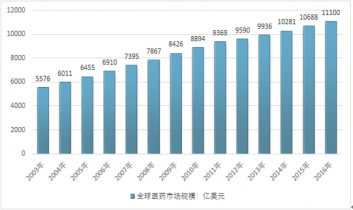 2016年全球醫(yī)藥市場規(guī)模(不含醫(yī)療器械)達(dá)到11100億美元,2011-2016年復(fù)合增長率高達(dá)6%。經(jīng)過多年的高速發(fā)展,以新興經(jīng)濟(jì)體為代表的發(fā)展中國家醫(yī)藥市場占比大幅提高,從2005到2016年的十年間新興經(jīng)濟(jì)體醫(yī)藥市場份額已經(jīng)從12%提升到30%。