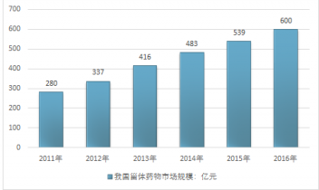 2011-2016年我國甾體藥物市場規(guī)模走勢圖 |