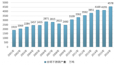 根據(jù)國際不銹鋼論壇(ISSF)發(fā)布的統(tǒng)計(jì)數(shù)據(jù),2016年全球不銹鋼產(chǎn)量4578萬噸,較2015年的4155萬噸增長10.18%。