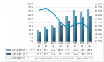 2010-2019年中國植物提取物行業(yè)出口及占比銷售比重 |