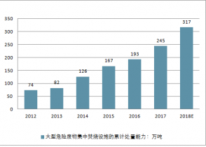 2012年至2016年大型危險廢物集中焚燒設(shè)施的累計處置能力從74萬噸增加至193萬噸,年均復(fù)合增長率高達(dá)27.08%,預(yù)計到2019年中國大型危險廢物集中焚燒設(shè)施的累計處置能力將超300萬噸。