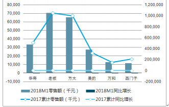 燃氣灶各品牌2019年1月和2019年累計的銷售金額及增速(千元、%)