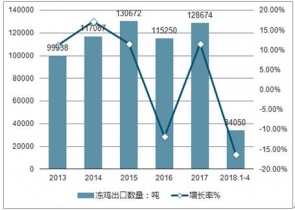 2019年1-4月中國出口凍雞3405萬噸,同比下滑16.2%;縱觀近五年中國凍雞出口數量情況,年均復合增長率為6.52%。
