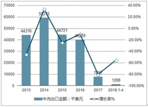 2019年1-4月中國牛肉出口金額為1288千美元,同比下滑55.4%;縱觀近五年中國牛肉出口金額情況,年均復合增長率為-35.03%。