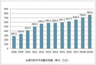 2008 年-2019 年國內軟件市場整體規模(單位:億元)